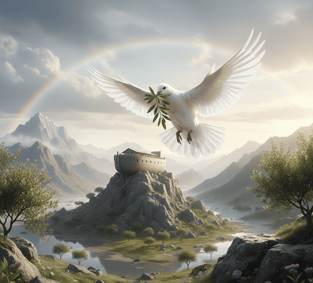 After the flood, a dove returned to the ark carrying an olive leaf, signaling that the waters had receded and life could begin again.