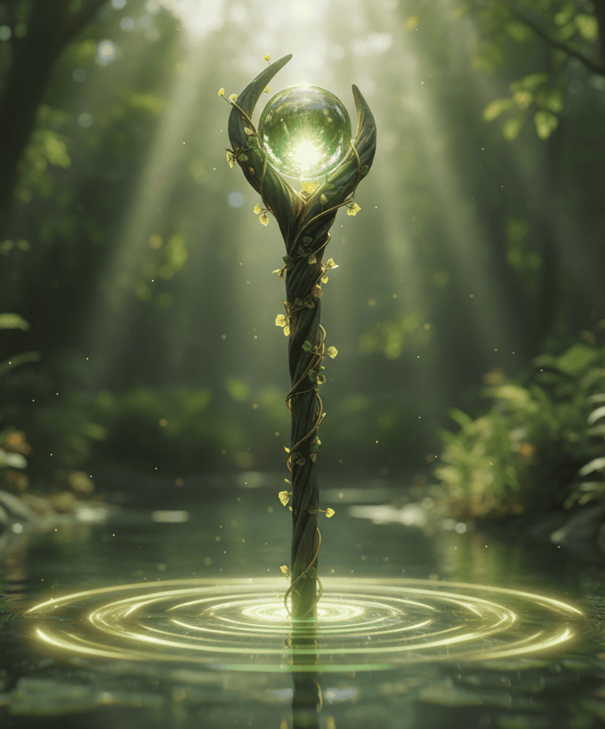 Some versions describe the staff as carved from a tree grown in paradise, glowing softly with a gentle green or golden light.