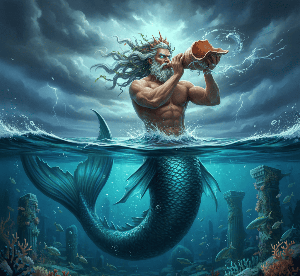 Legends say Triton could sing storms into existence. His call echoed through the deep like a conch shell awakening the sea itself.