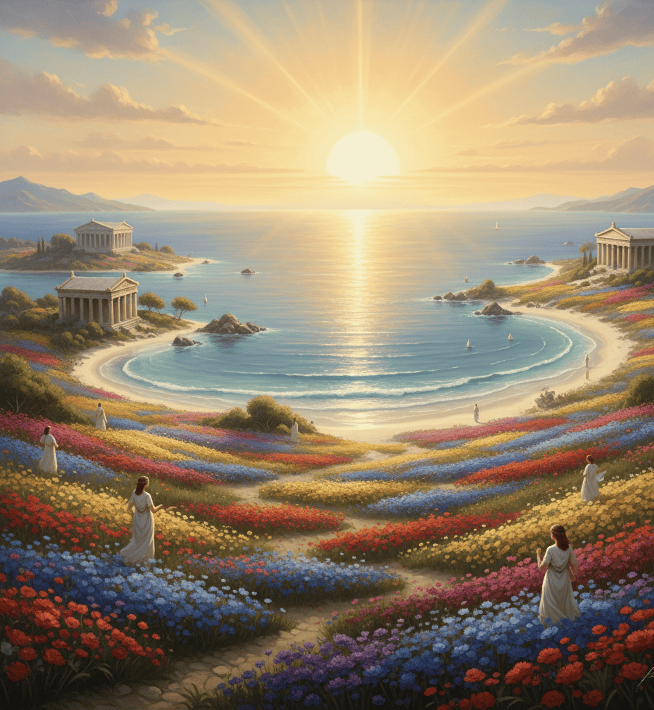 Unlike the dark gloom of Hades, the Elysian Islands were full of light. Gentle breezes blew, fields sparkled with flowers, and the sea shimmered with calm.