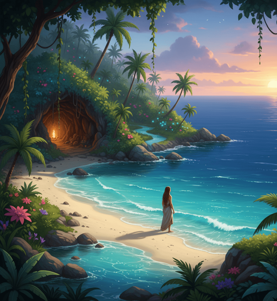 The island was described as lush, filled with fragrant forests, flowing rivers, and caves that glowed with light.