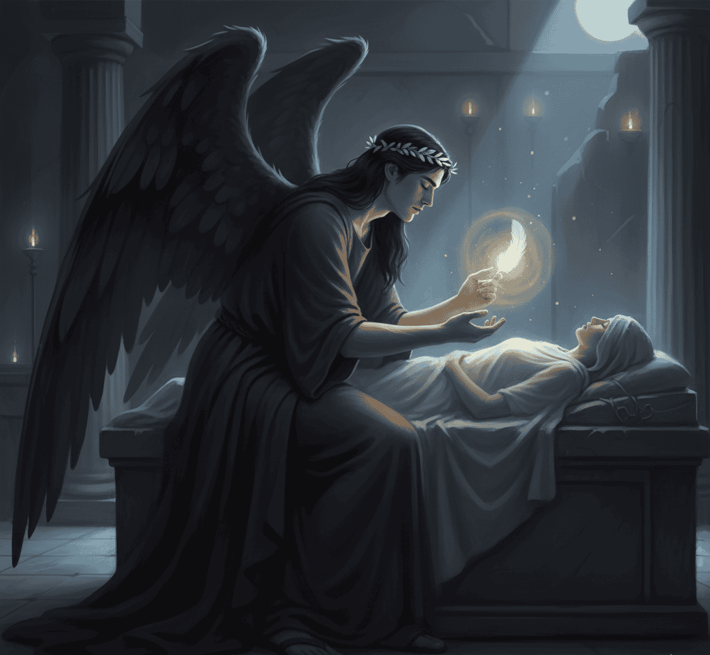 Thanatos, the god of peaceful death, is not a monster but a gentle presence. He is the one who helps souls cross from life into rest.