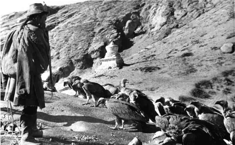 In Tibet, some people practice sky burial, where the body of the deceased is placed on a mountaintop for vultures to eat.