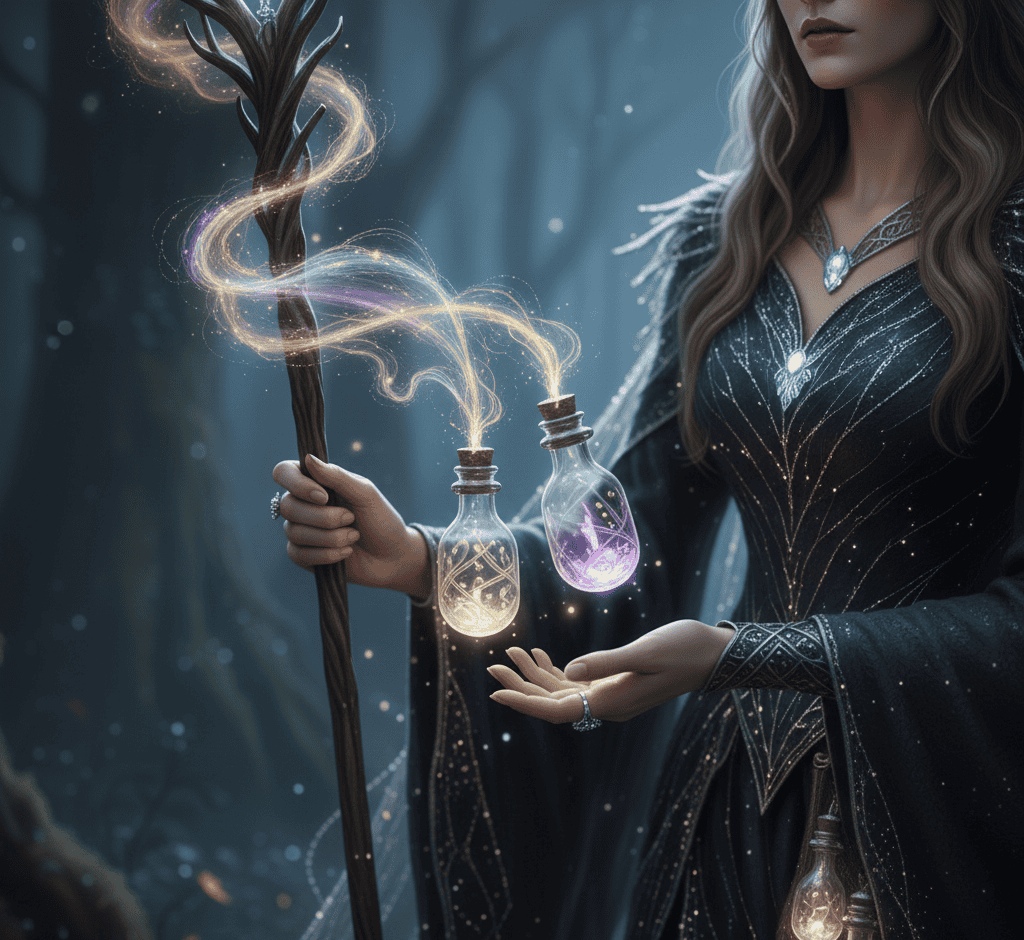 When she finds a dream worth keeping, she gently lifts it with her staff. The dream coils and dances around the glowing wood until she guides it into a crystal bottle.