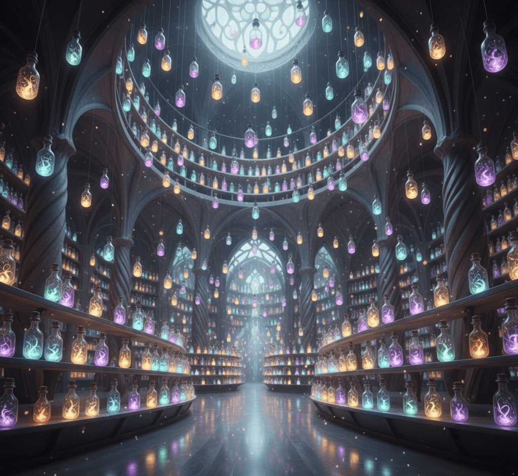 Its halls curve like tree roots. And in one grand chamber lies her dream gallery. Thousands of crystal bottles float in the air. Some hum with a soft sound. Others glitter with a light that never dims.