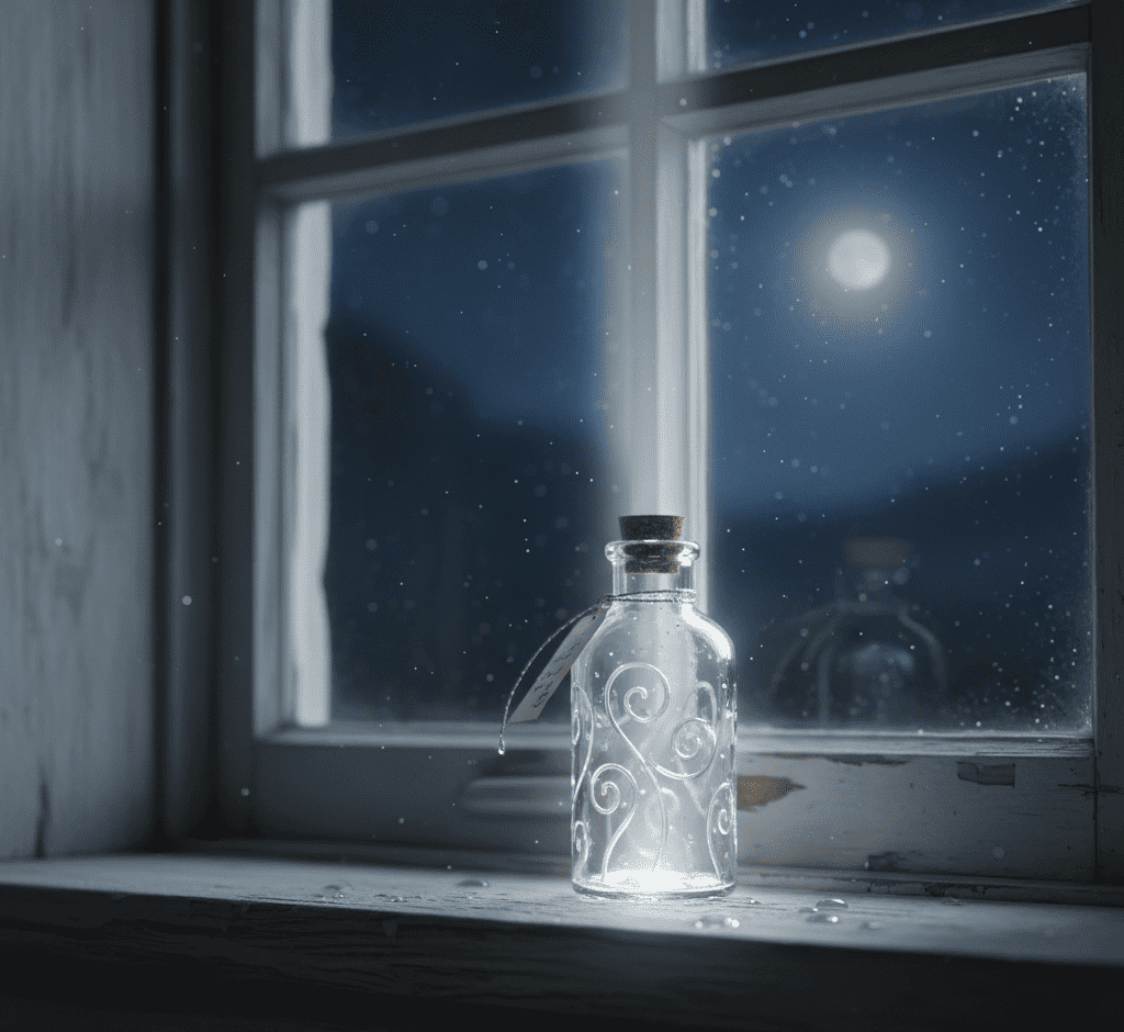 These dreams become her collection, sealed inside crystal bottles that glow with soft colors. Some say she keeps them for wisdom.
