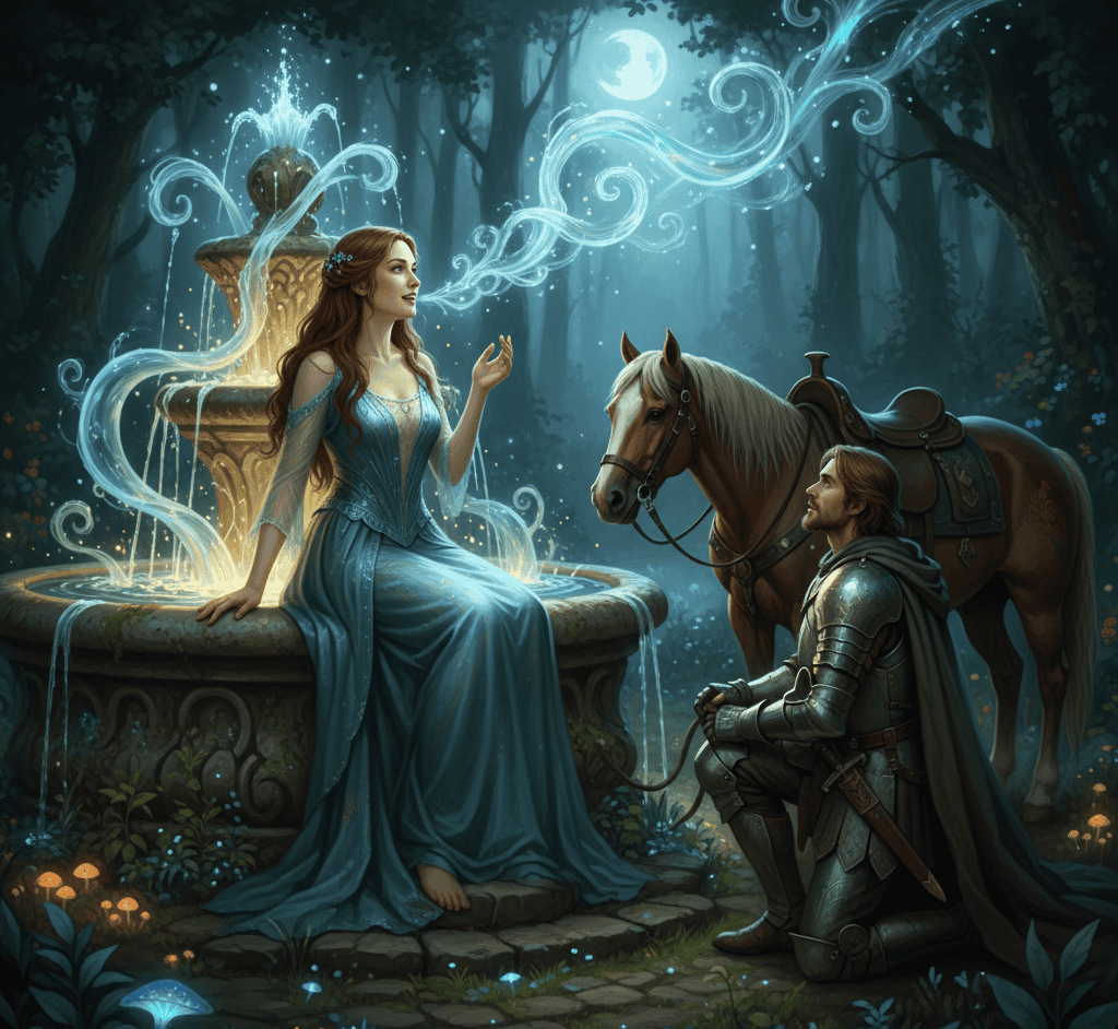One of the earliest stories places Melusine at a fountain, singing so sweetly that a weary knight named Raymondin could not resist approaching.
