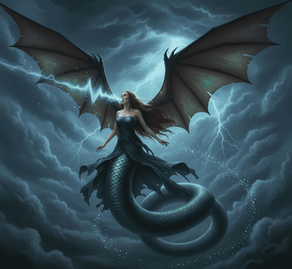 In some versions of the tale, Melusine does not simply vanish but transforms fully into a winged serpent, flying away with a scream that echoed like a siren’s final song.
