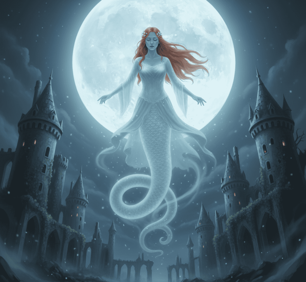 After her secret was revealed, Melusine was doomed to wander. In some traditions, she returned to her husband’s castle in spectral form, flying around its towers and crying for her lost life.