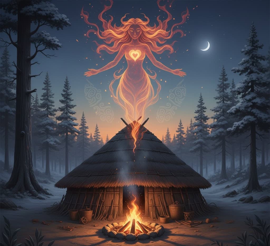 Fire was central to Ainu life, and women were its protectors. One myth tells of a devoted wife who cared for her hearth with such love that when she died, her spirit merged with the flames.