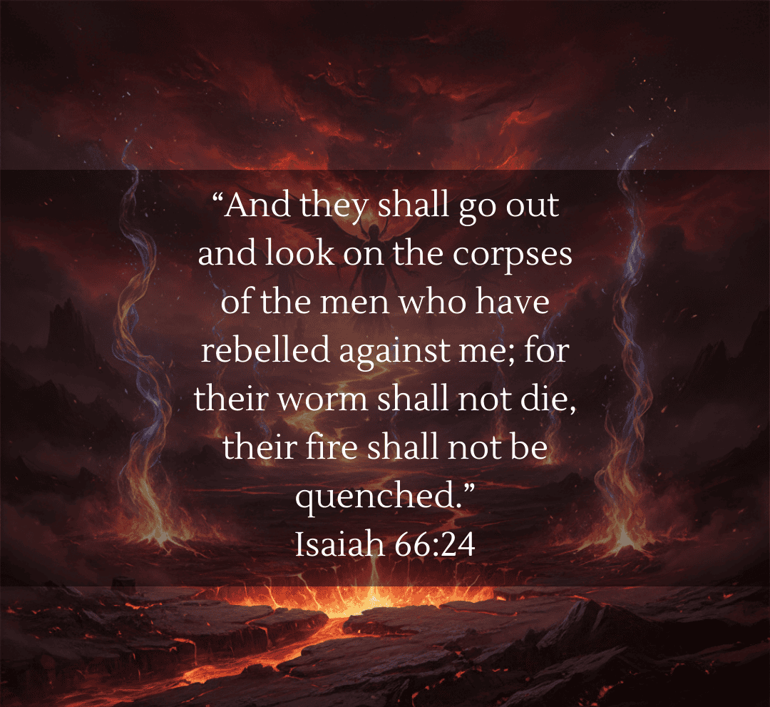Isaiah 66:24 presents a terrifying vision of those who rebel against God: “And they shall go out and look on the corpses of the men who have rebelled against me; for their worm shall not die, their fire shall not be quenched.”