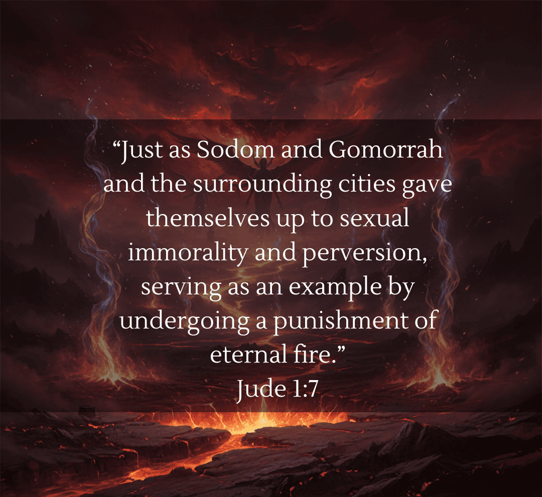 “Just as Sodom and Gomorrah and the surrounding cities gave themselves up to sexual immorality and perversion, serving as an example by undergoing a punishment of eternal fire.”