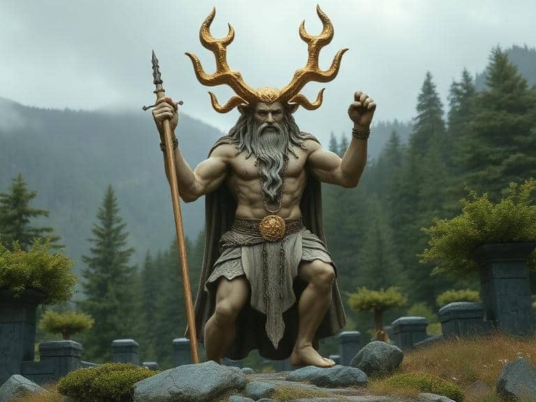 Cernunnos is depicted with antlers, symbolizing the bounty of nature and potency.