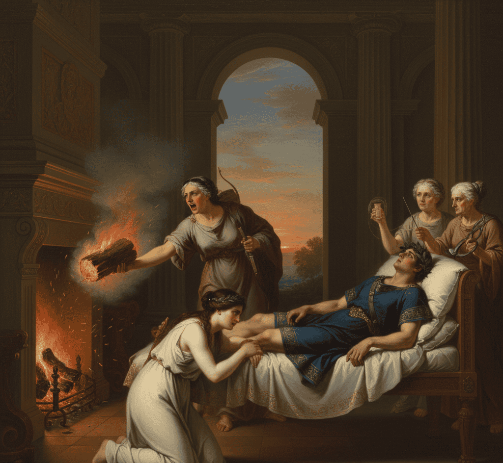 Meleager’s life was tied to a log hidden away by his mother. When conflict broke out after the hunt, his mother, enraged at the death of her brothers, threw the log into the fire, ending her son’s life.