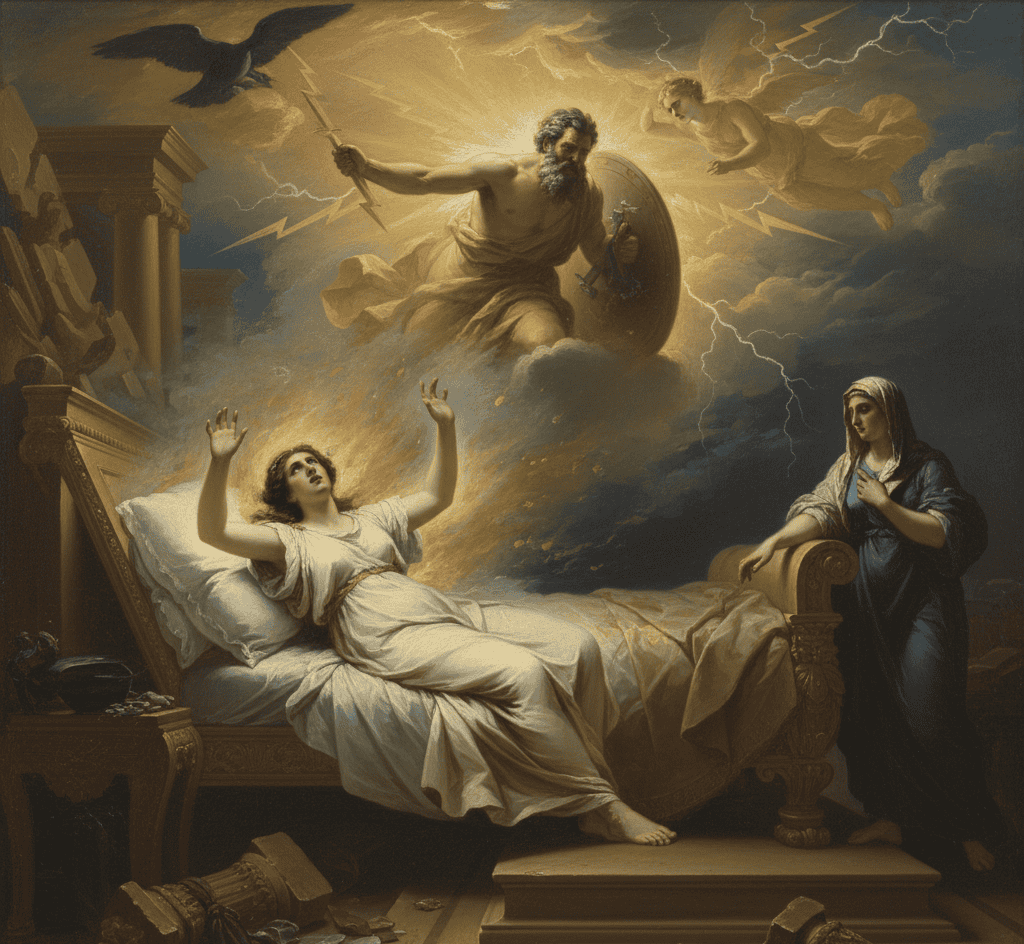 Bound by oath, Zeus complied, and the mortal woman was burned to ash by his blazing glory.