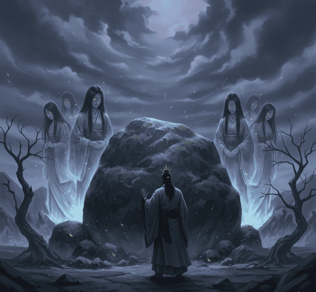 Overcome with grief, Izanagi journeyed to Yomi, the land of the dead, to bring her back.