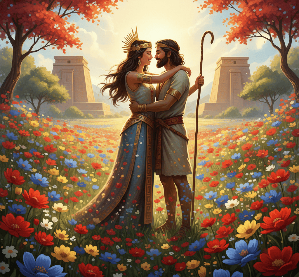 In the Mesopotamian legend, the goddess Inanna loved the shepherd Dumuzi, whose charm and gentleness captured her divine heart.