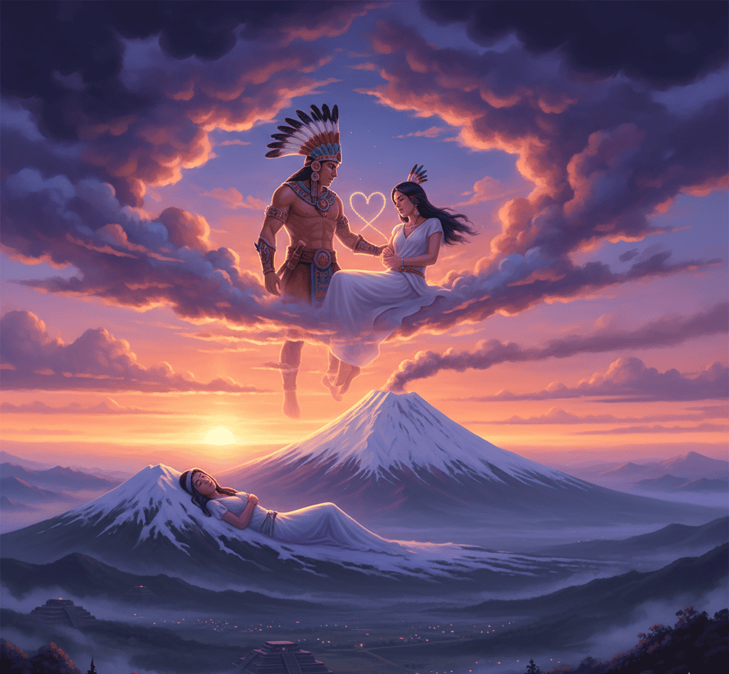 Even now, Popocatépetl, the smoking mountain, watches over the sleeping Iztaccíhuatl, his eternal flame a symbol of his devotion.