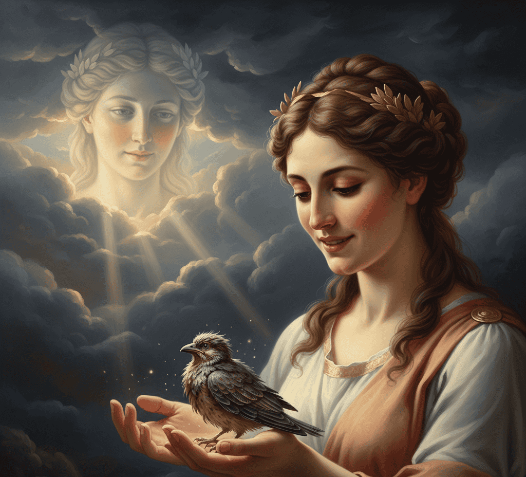 Following her counsel, Zeus disguised himself as a small bird caught in a storm. Hera pitied the trembling creature and sheltered it.