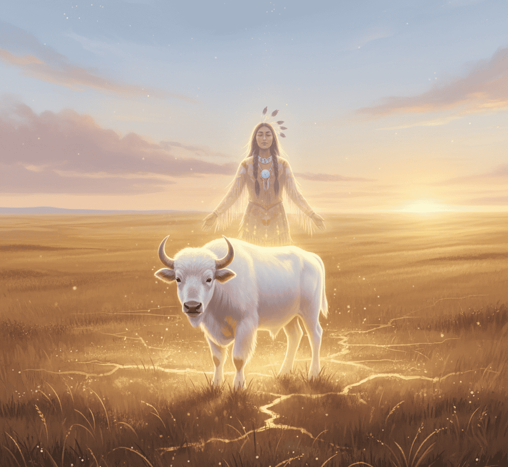 The Lakota people tell of White Buffalo Calf Woman, a sacred figure who brought the seven sacred ceremonies and taught respect for all living beings.