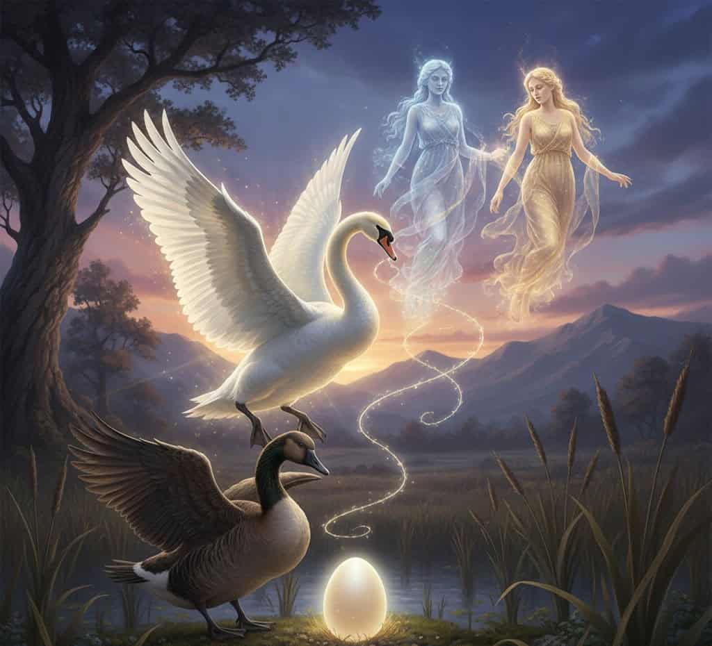 To escape him, Nemesis transformed into a goose, but Zeus turned into a swan and caught her. From their union came an egg, which was later given to Queen Leda, who raised Helen as her own.
