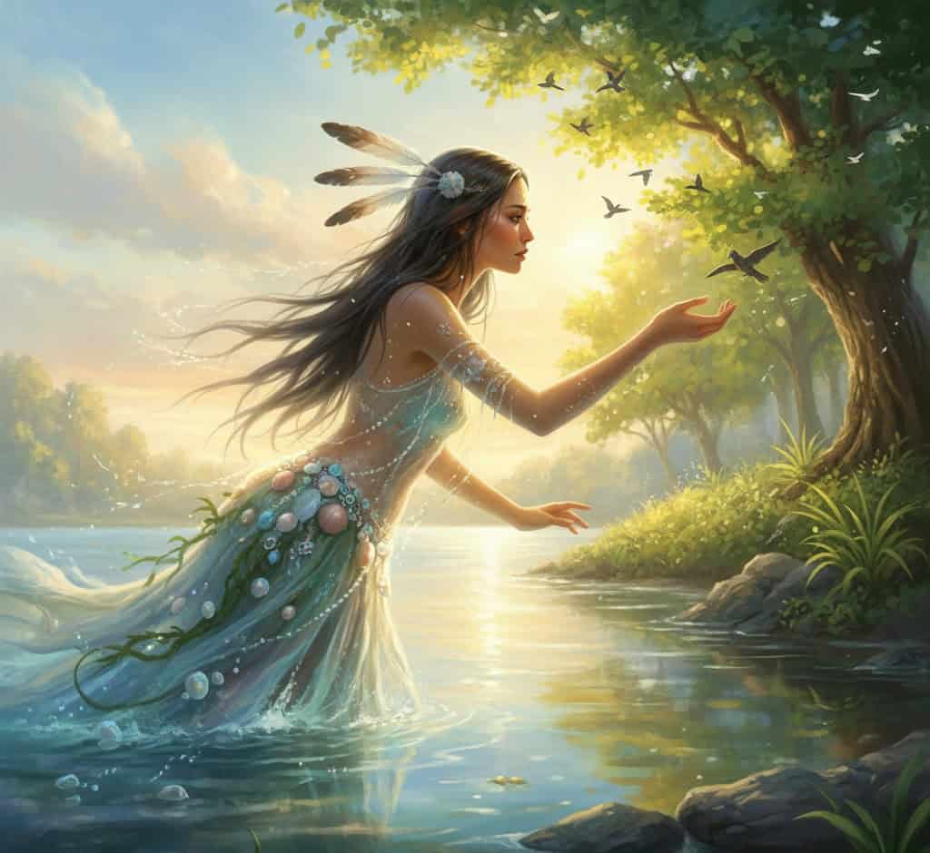 The next moment, a water spirit rose from the surface, shimmering like sunlight on waves. He asked her to come live with him beneath the waters.