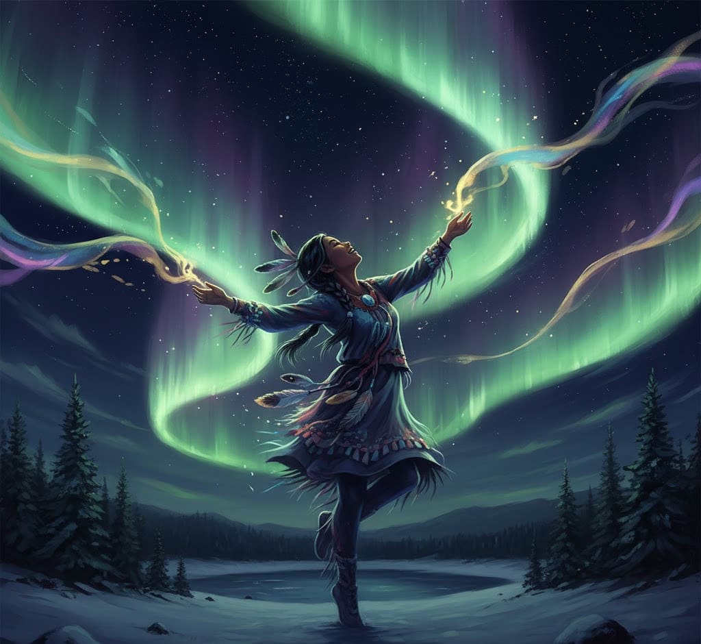 When hunters see the aurora, they say it is the spirit bride playing and laughing among the stars, reminding everyone that beauty and love live in the heavens.