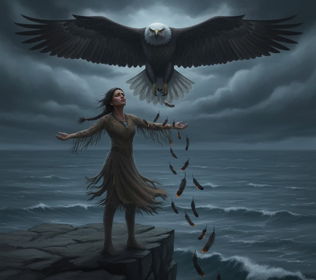 In a tale told among the Haida, a woman stood by the sea mourning her lost lover. A great eagle flew down and transformed into a man, offering her comfort.