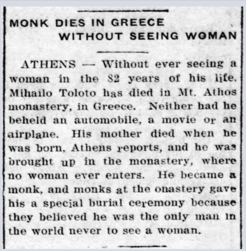While other men might have seen women before becoming monks, Mihailo reportedly never had that experience at all. His entire world existed within the quiet boundaries of Mount Athos.