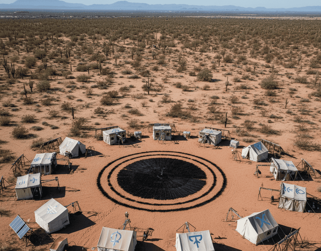 Her group, The Children of the Last Light, built a camp in the desert, covered in solar panels and silver symbols.