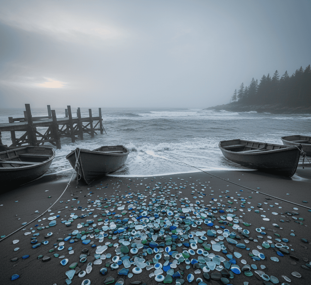 Fishermen saw them rowing into the mist at sunrise, returning with handfuls of smooth blue glass they said came from “the shining city below.”