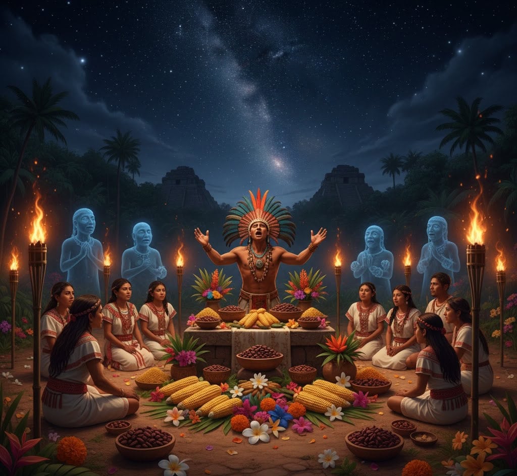 Families would gather near altars filled with offerings of maize, cacao, flowers, and copal. Shamans led chants that called upon ancestors to join the living once more.