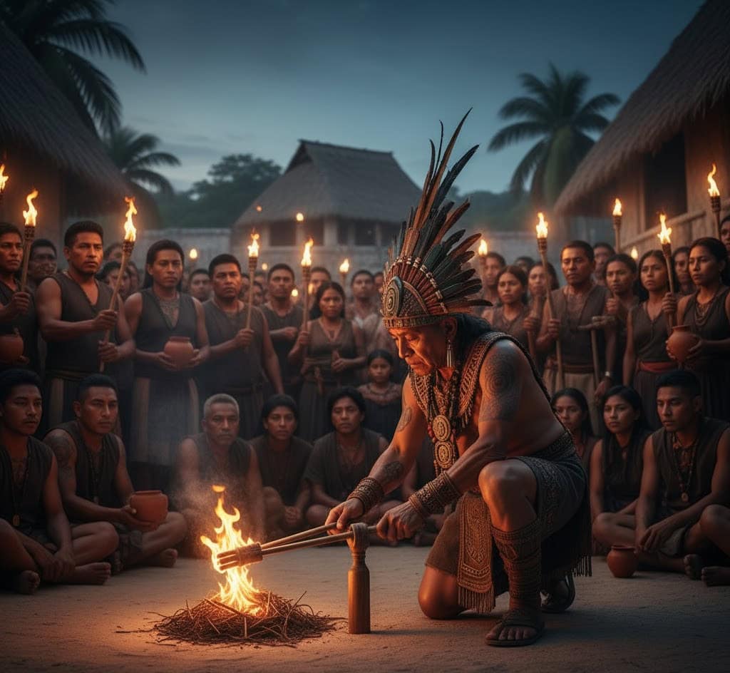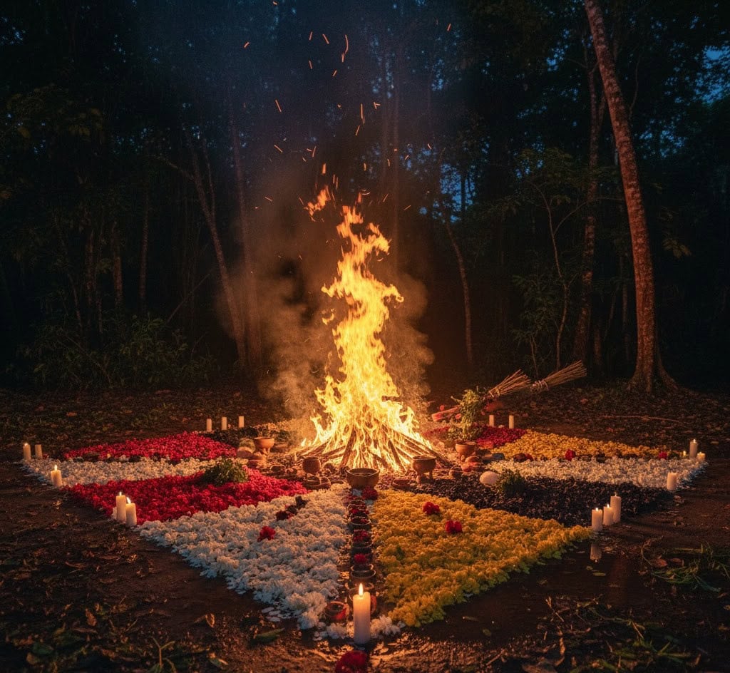 Fire was a living spirit in Mayan belief, a messenger between worlds. During the Fire Ceremony, priests would build sacred fires surrounded by colored candles or flowers representing the four cardinal directions.