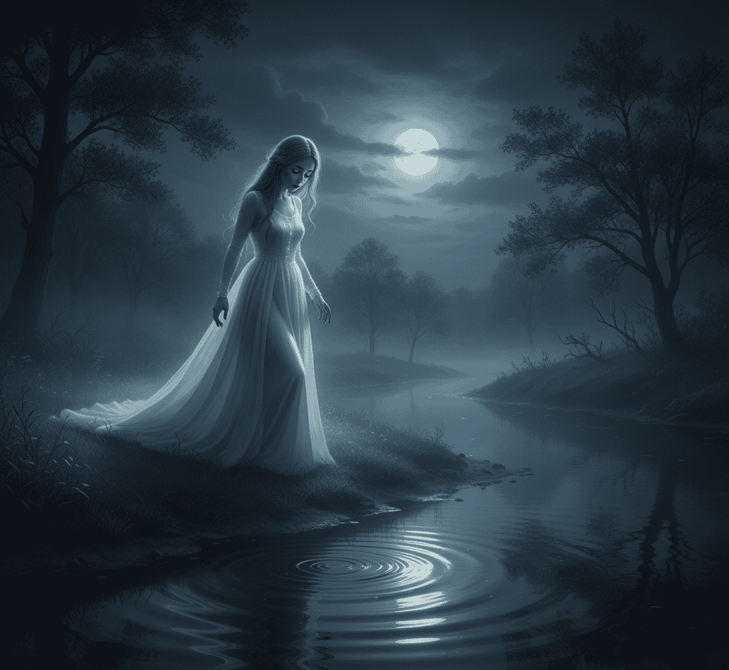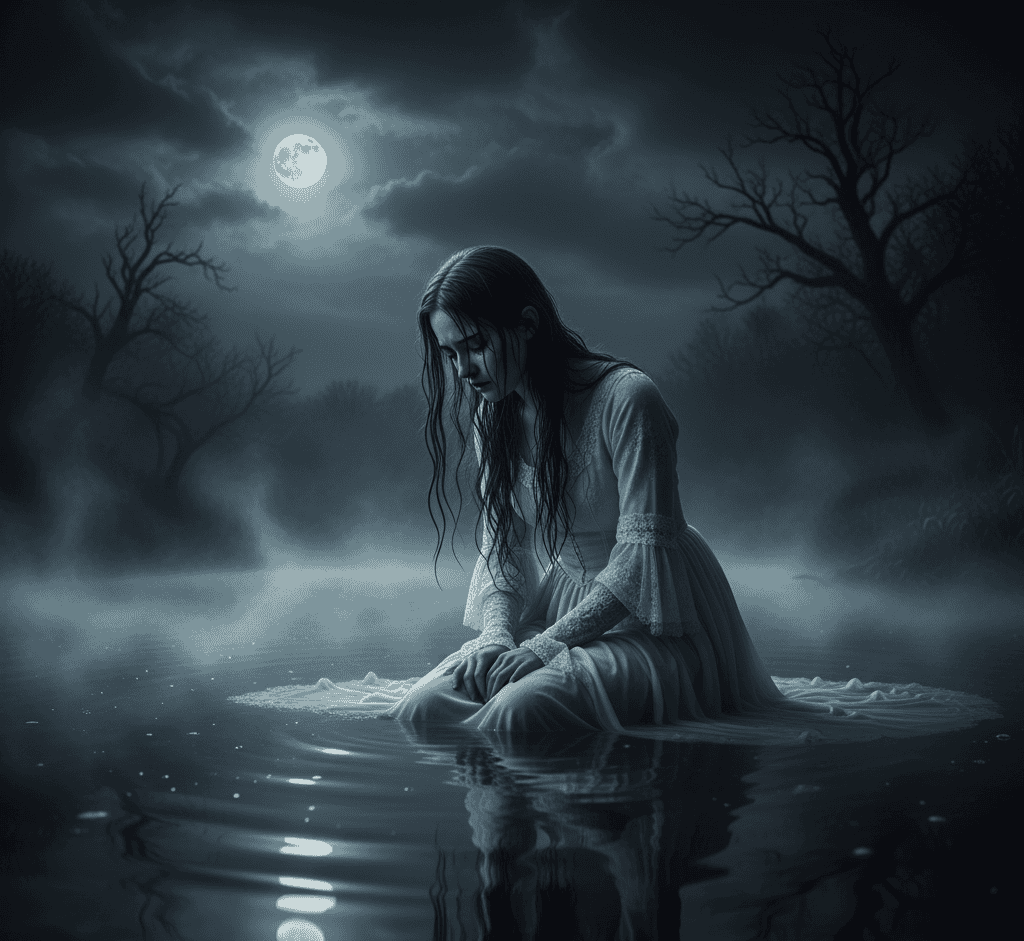 She roams rivers, lakes, and canals, wailing endlessly. Her cries are said to echo in the darkness, chilling anyone who hears them.