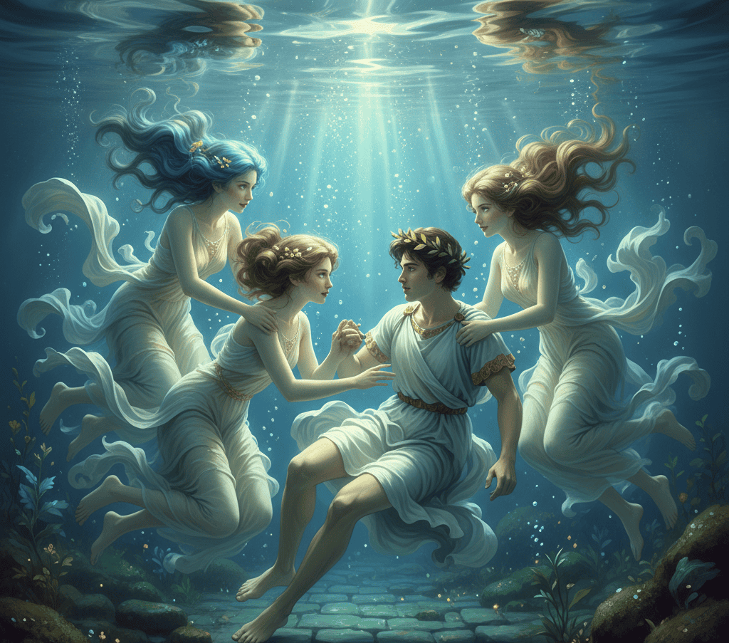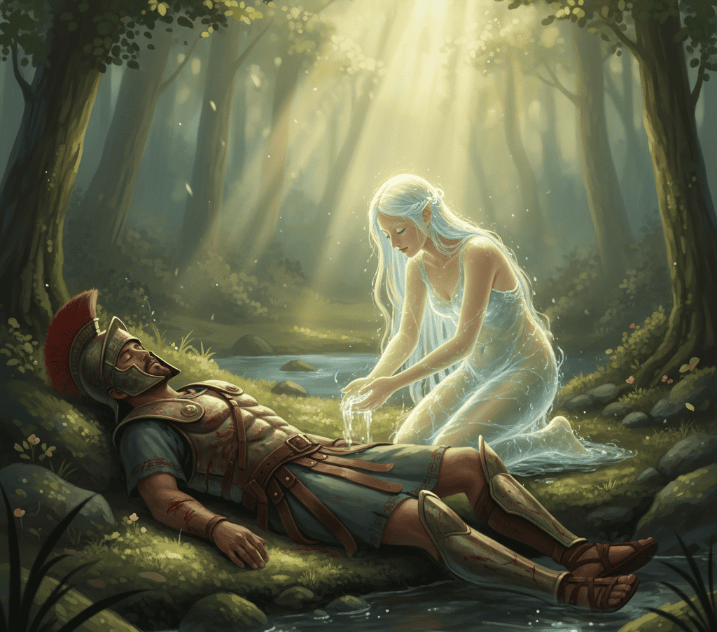 A naiad found him, bathed him in her water, and restored his strength. When he woke up, she was gone, leaving only ripples that shimmered like her touch.