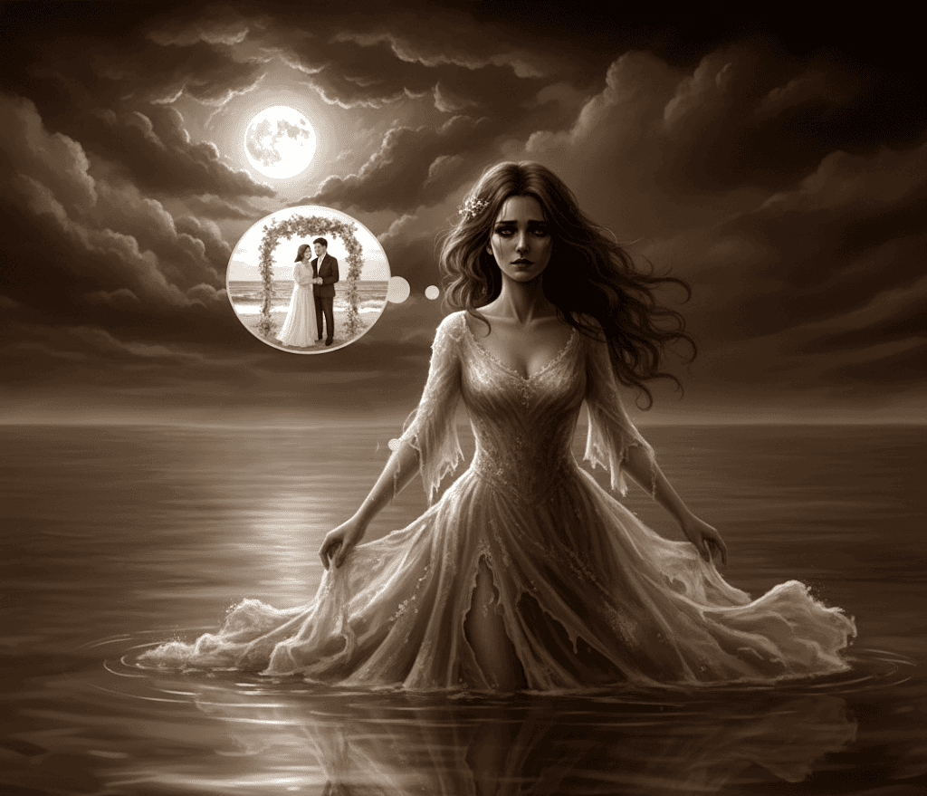 Every dawn, she walks to the shore, her hair wet from tears, staring at the horizon. When a storm sweeps through, she is swept away by the sea, her spirit bound to the waters that once brought her love.