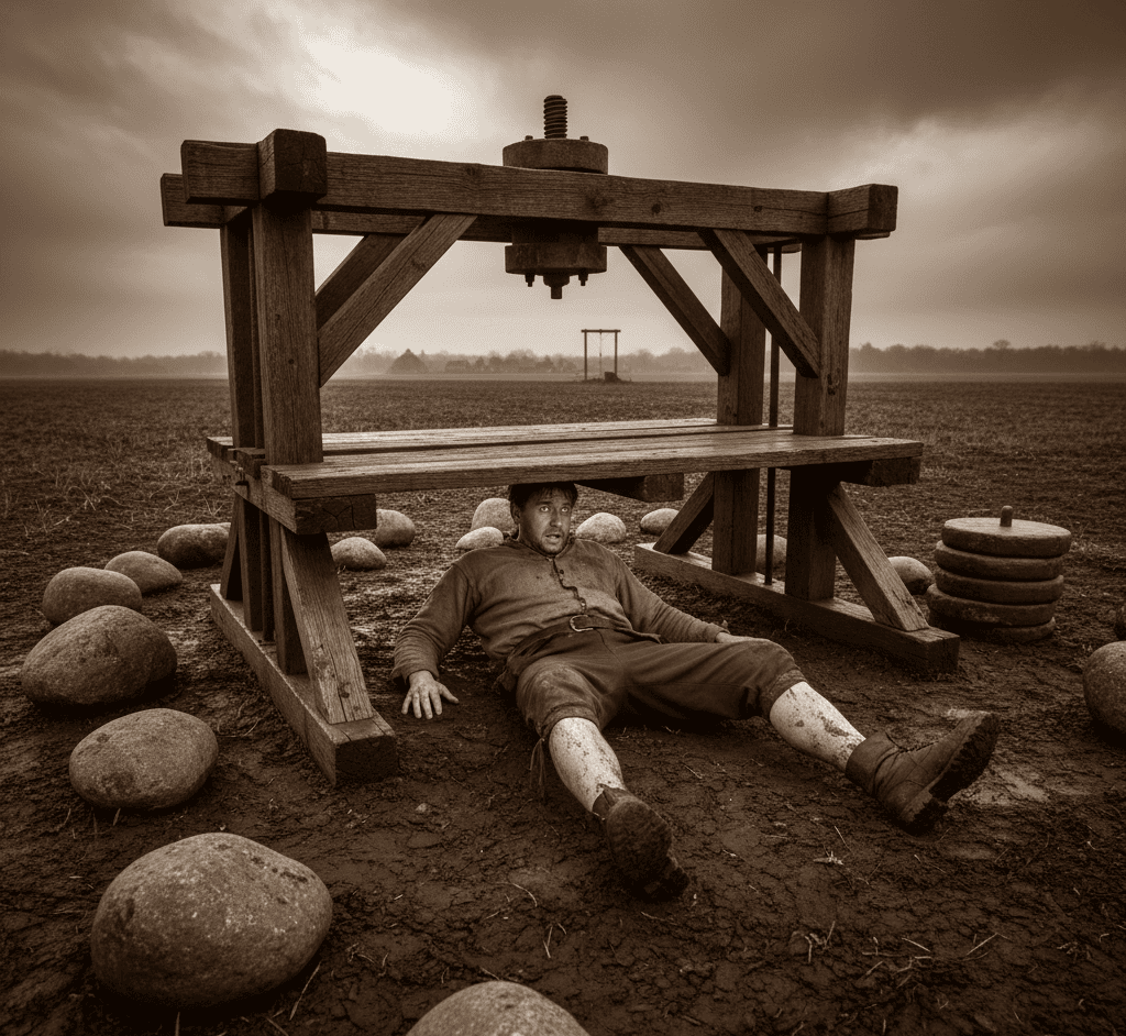 His defiance led to his brutal death by pressing, as heavy stones were placed on his body until he was crushed.