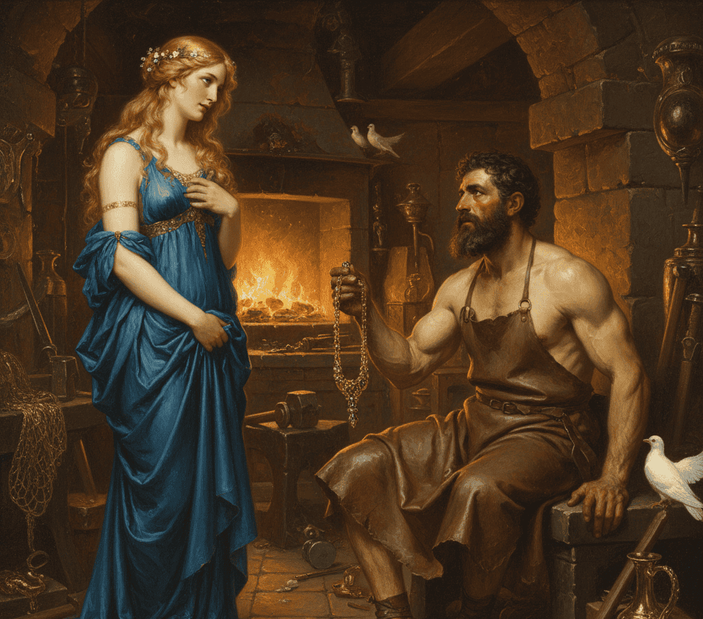 Hephaestus was not handsome like Adonis or charming like Hermes. Yet his artistry was unmatched, and he forged Aphrodite the most beautiful jewelry and gifts.