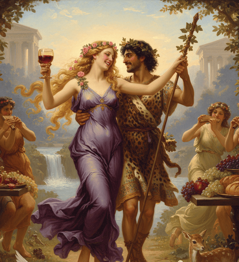 Aphrodite and Dionysus, the god of wine and revelry, shared a love full of indulgence. Their union was playful, filled with laughter, music, and endless feasts.
