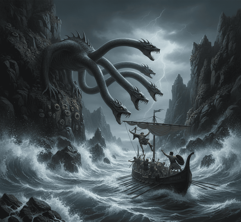 Scylla would only take a few men. It was a terrible choice, but Odysseus listened. As they passed the cliffs, Scylla rose with terrifying speed.