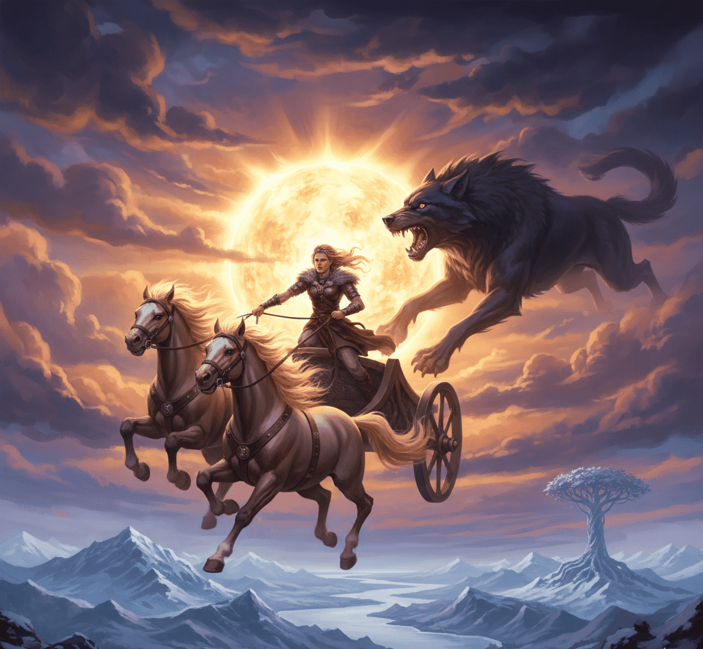 In Norse myths, the sun goddess Sol rode across the sky in a chariot pulled by swift horses. But unlike the serene journeys of other sun gods, Sol was constantly pursued by a great wolf named Skoll.