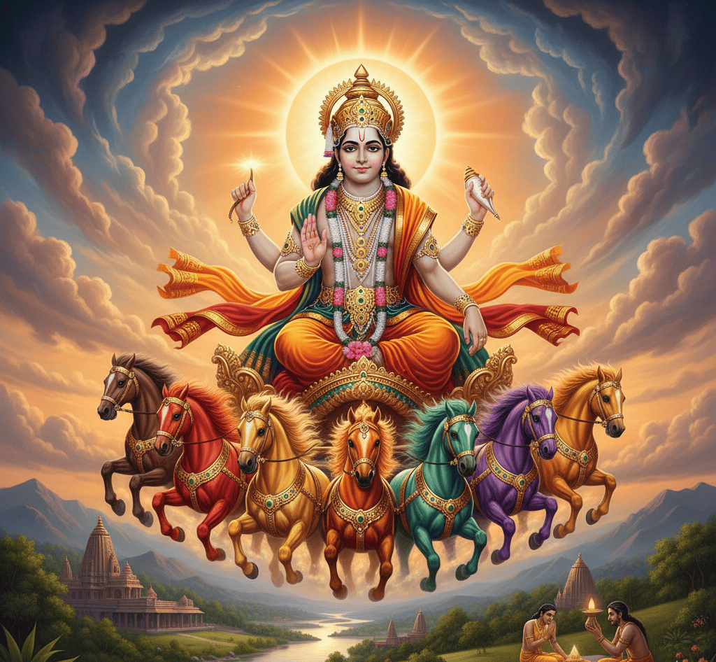 Surya is also linked to healing powers, believed to strengthen the body and mind through his radiant blessings.