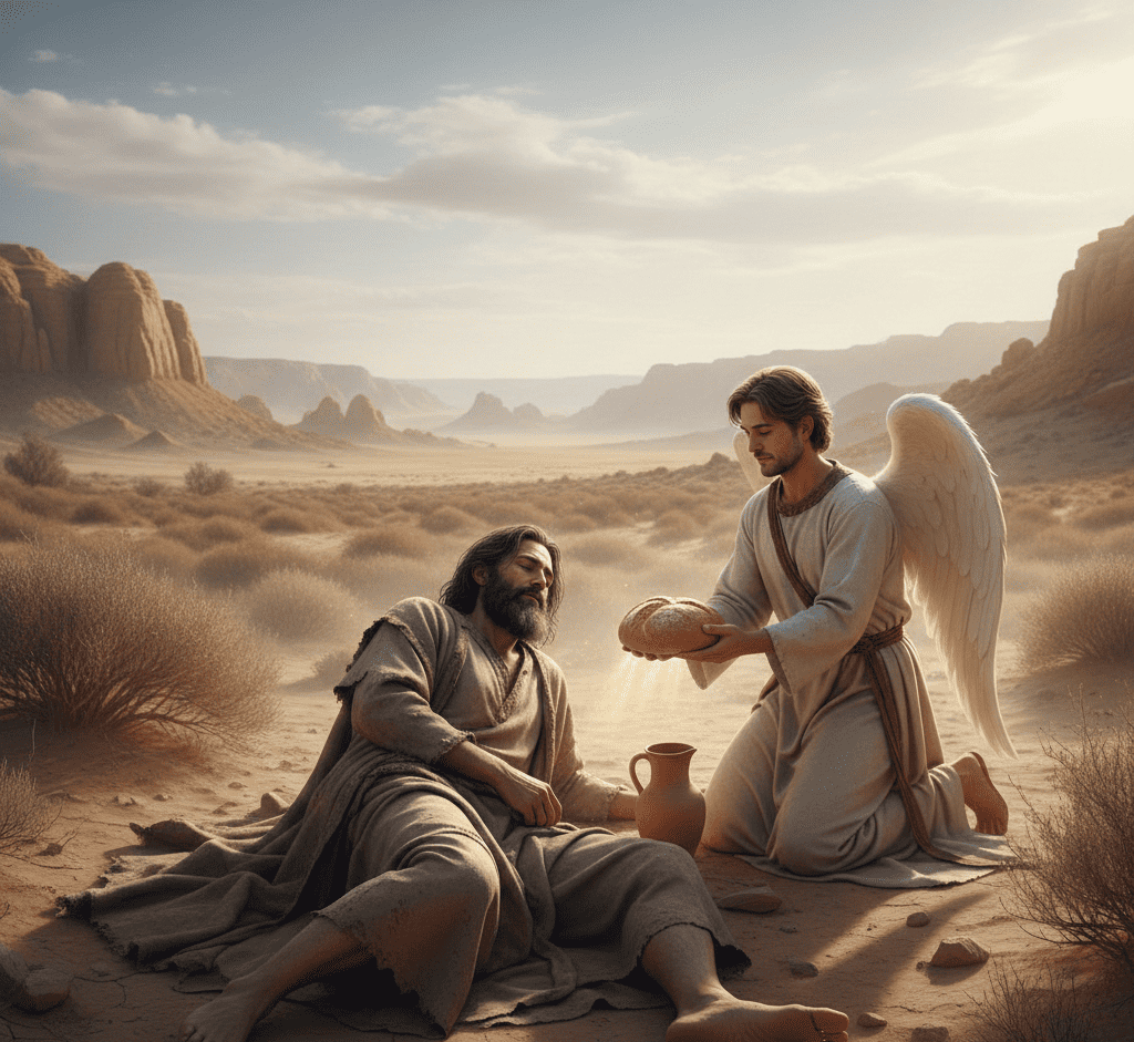 Alone and overwhelmed, he lay down and asked to die. At this low point, an angel appeared and provided food, water, and encouragement.