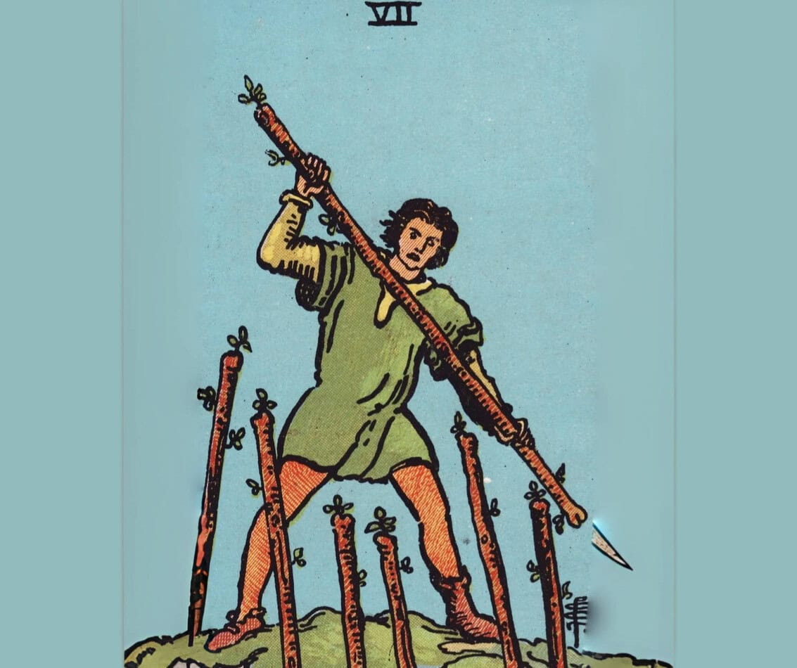 A hero standing alone, fighting against multiple unseen enemies – that’s the Seven of Wands.