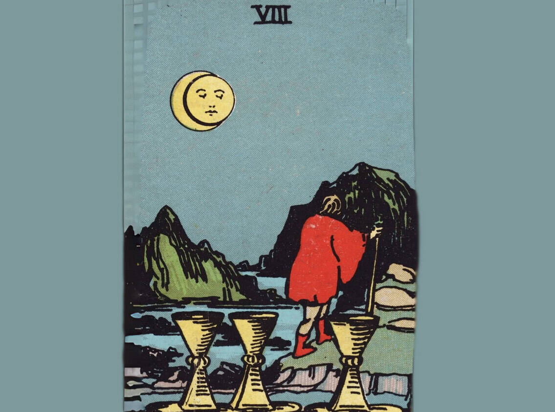 The Eight of Cups shows someone walking away from a full set of cups, meaning they’re leaving behind what once mattered.