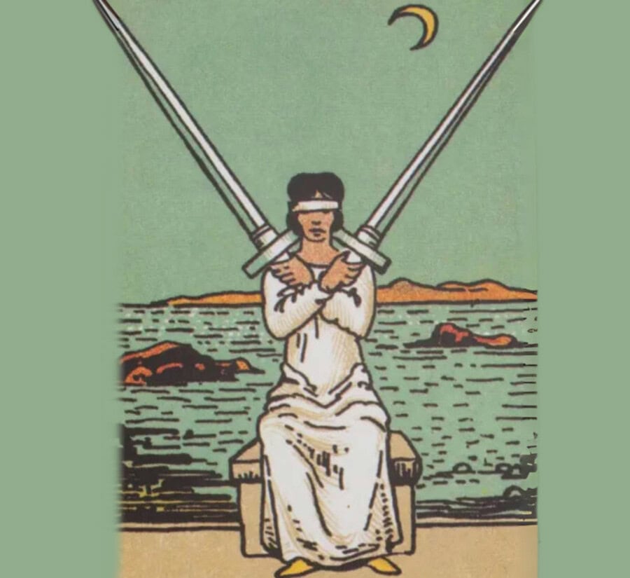The Two of Swords shows a blindfolded woman, sitting with two swords crossed over her chest.