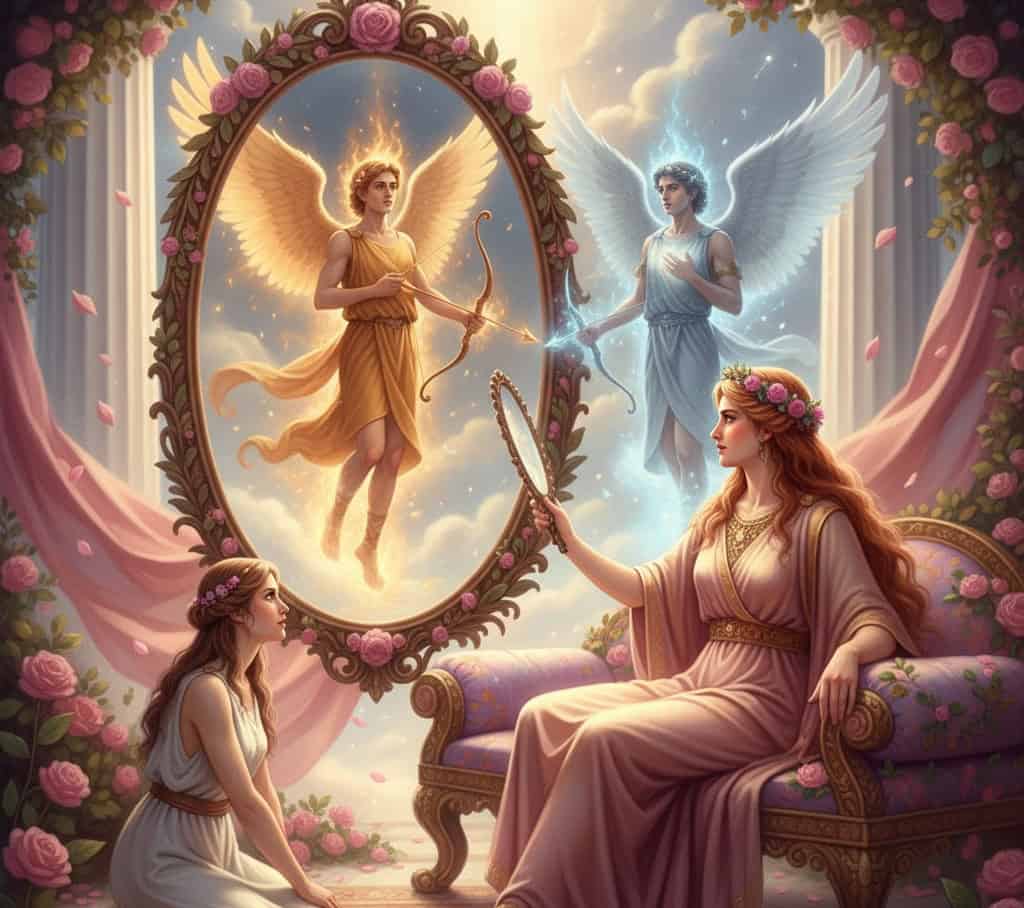 Aphrodite once gazed into her mirror and saw not her reflection, but the image of her two sons, Eros and Anteros.