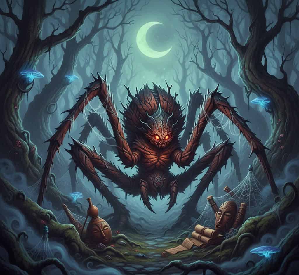 In one story, he tricks other animals to win a woman’s affection, only to lose everything because of his vanity. His web symbolizes how easily people get entangled in their own emotions.